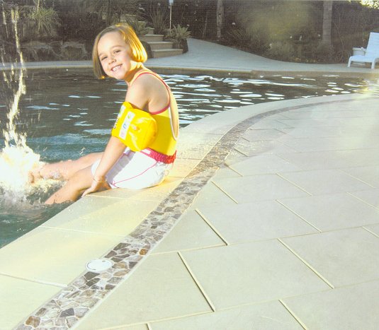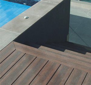 With the current trend of larger paving areas and less joints, Coloured Concrete becomes an attractive option. This is best to go from the back of the pool edges coping, and can either be cut into squares or, as in the photo, divided by hardwood timber headers.