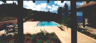BELOW: A generous fan shaped space between the wings of the house provides an ideal sheltered location for this clean lined pool. The raised planter provides an attractive back drop and the water feature is viewed from most rooms.