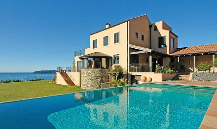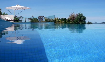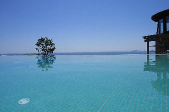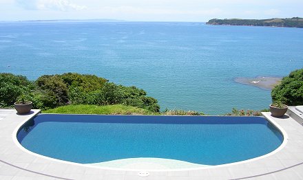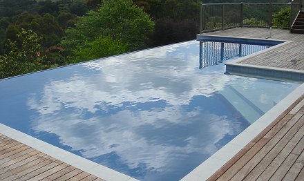 Infinity pools are also known as weir edge, vanishing edge or negative edge pools. The engineering design involves either a catchment trough (which is also a storage/overflow catchment) or a hidden gutter system, to a storage tank located out of view. The water cascades over the weir into this collection system that runs along beneath the whole length of the weir. The effect when viewed by a bather in the pool is very dramatic when the edge appears to merge with sea in the background or even the sky if the pool is located high up on a hillside. So long as the edge of the pool is not a walk-way then it does not need a hand rail or fence.